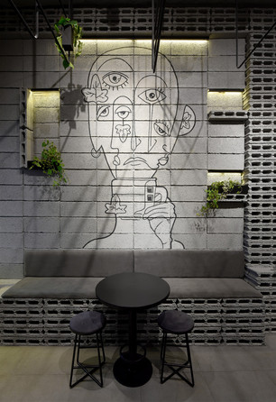 Choosing a material with a different texture and a neutral color, such as a block, required a reverse complement. Choosing a plant texture next to it, in addition to creating a colorful touch, also greatly contributed to the vitality of the space. Therefore, according to the conditions of indoor spaces, a plant called miniature ivy was selected, which is basically suitable for indoor spaces, and in case of favorable conditions, it grows a lot. This complement played such an important role that even The name of the cafe was chosen from it.