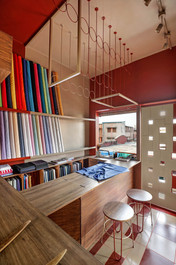 The two shades of contrasting of red and ivory grey color were chosen to represent the store: straight, uniterrupted with furniture profiles, vibrant ambience. The bold lines of overhang metal frames define the possibility of storage for fabric rolls creating a simple environment. While the voids are used to store textile fabrics.