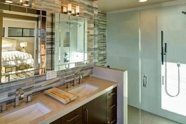 As the client ascends the staircase, the design transitions from solid and grounded to light and open, adding a gradual sense of much needed decompression.